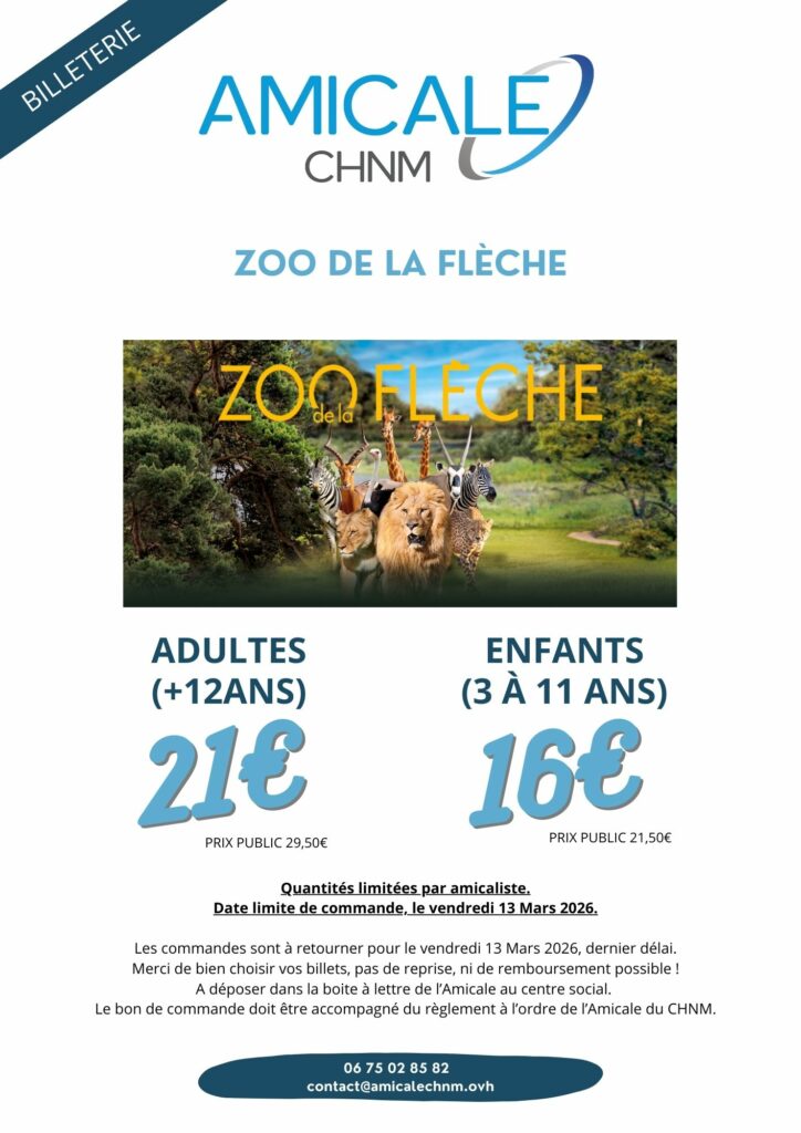Découvrez l’offre exclusive de L’Amicale du CHNM pour le Zoo de la Flèche, l’un des plus beaux parcs zoologiques de France, situé en Sarthe. Partez à la rencontre de plus de 1500 animaux venus des quatre coins du monde dans un cadre naturel et préservé. Profitez d’un tarif spécial pour une journée riche en découvertes et émotions, avec des animations, des spectacles et des rencontres uniques avec les animaux. Ne manquez pas cette occasion de vivre une expérience inoubliable en famille au Zoo de la Flèche !